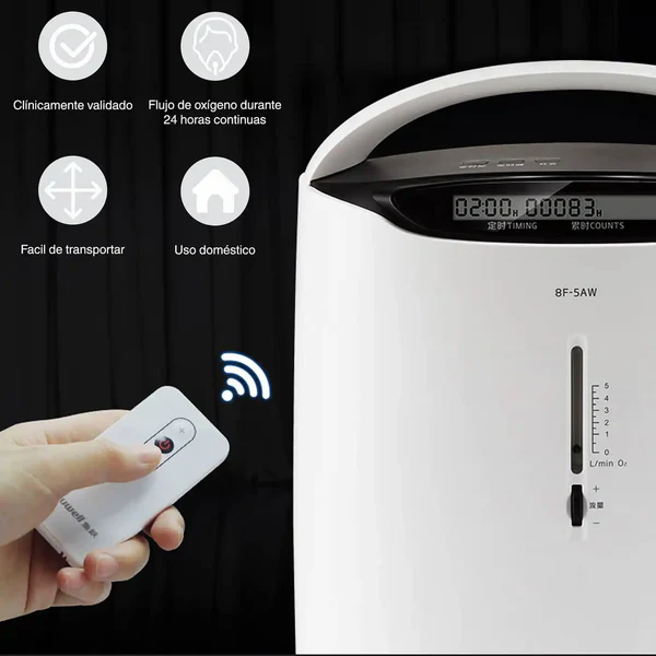 El Concentrador de Oxígeno Yuwell 8F-5AW ofrece un suministro constante de oxígeno y la versatilidad del nebulizador, diseñado para ofrecer una solución integral para tus necesidades respiratorias.